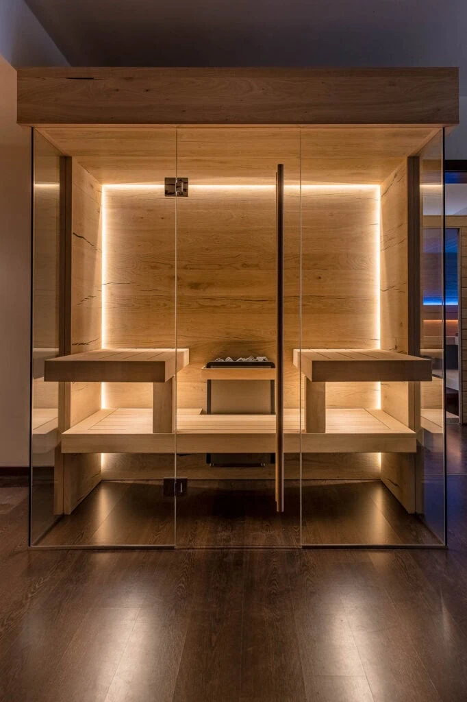 Ganzglasfront für eine transparente Optik. Saunabeleuchtung: indirekte LED-Beleuchtung als Effektbeleuchtung der hinteren Wand und in den Liegen.