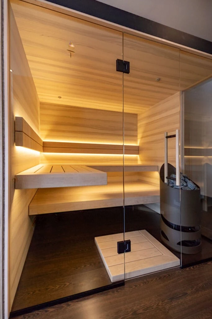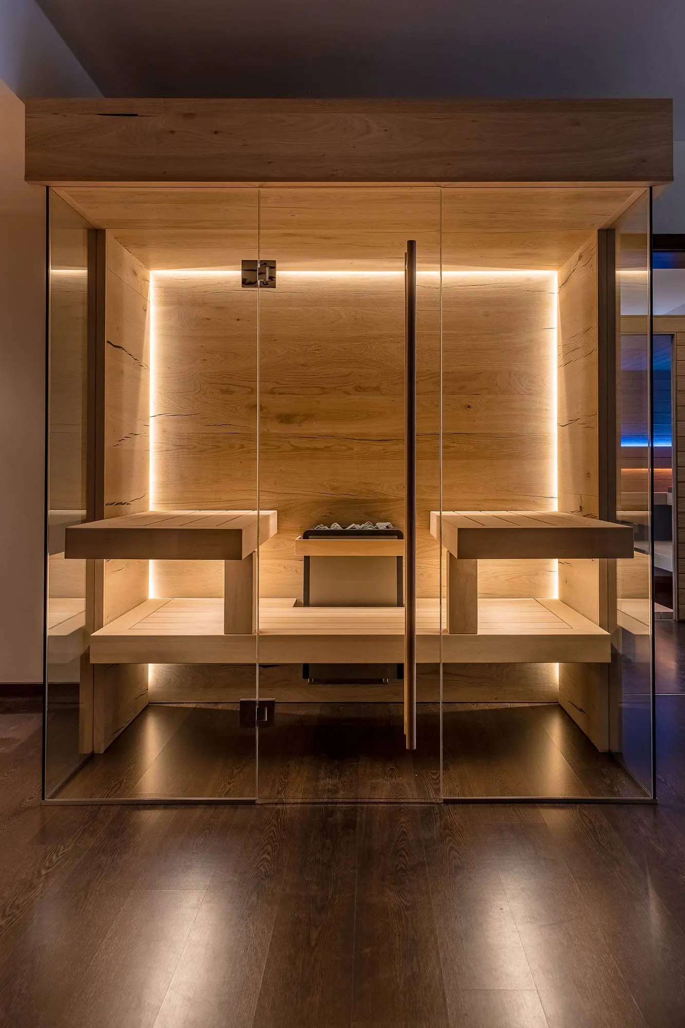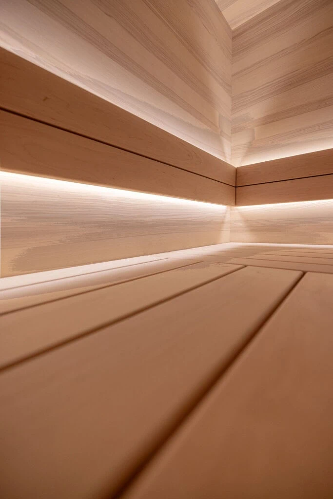 Sauna in Thermo-Lärche Echtholzfurnier mit waagerechter Verlegung. Die Saunabänke sind farblich abgestimmt aus massivem Thermo-Espenholz angefertigt. Ganzglasfront mit Thermoverglasung für eine transparente Optik. Saunabeleuchtung: indirekte LED-Beleuchtung in den Rückenlehnen und in den Liegen.