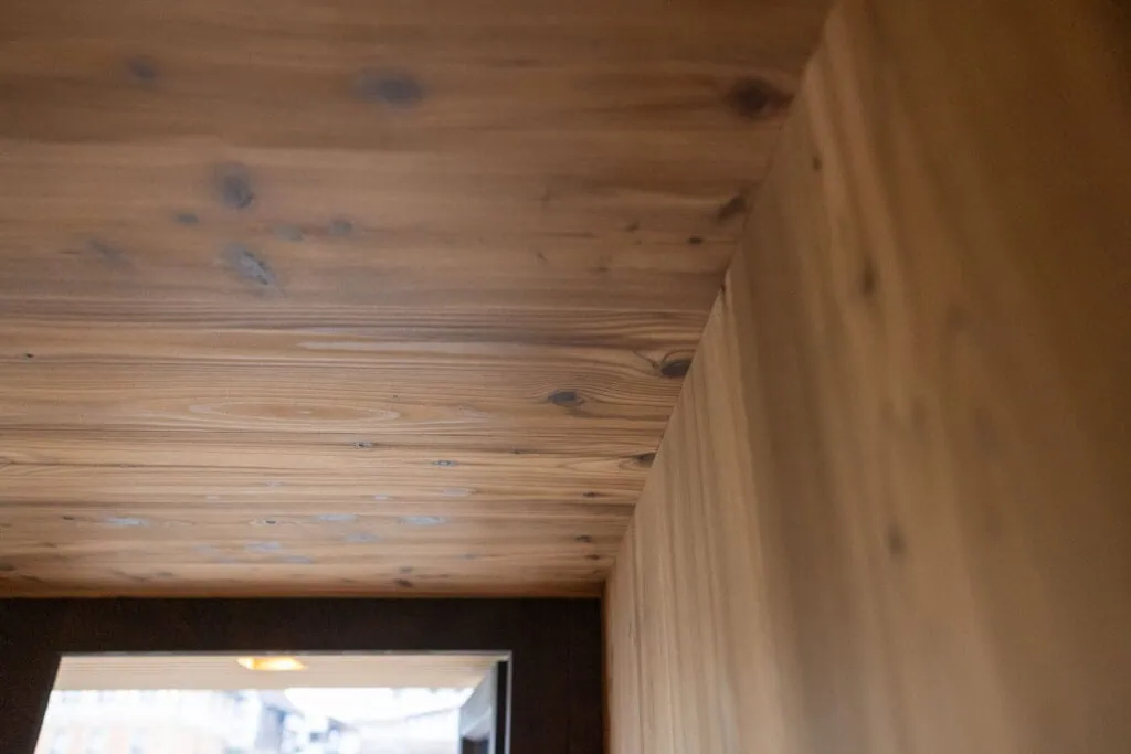 Sauna in hellem Espenholz mit senkrechter Verlegung. Die Saunabänke sind ebenfalls aus massivem Espenholz angefertigt.