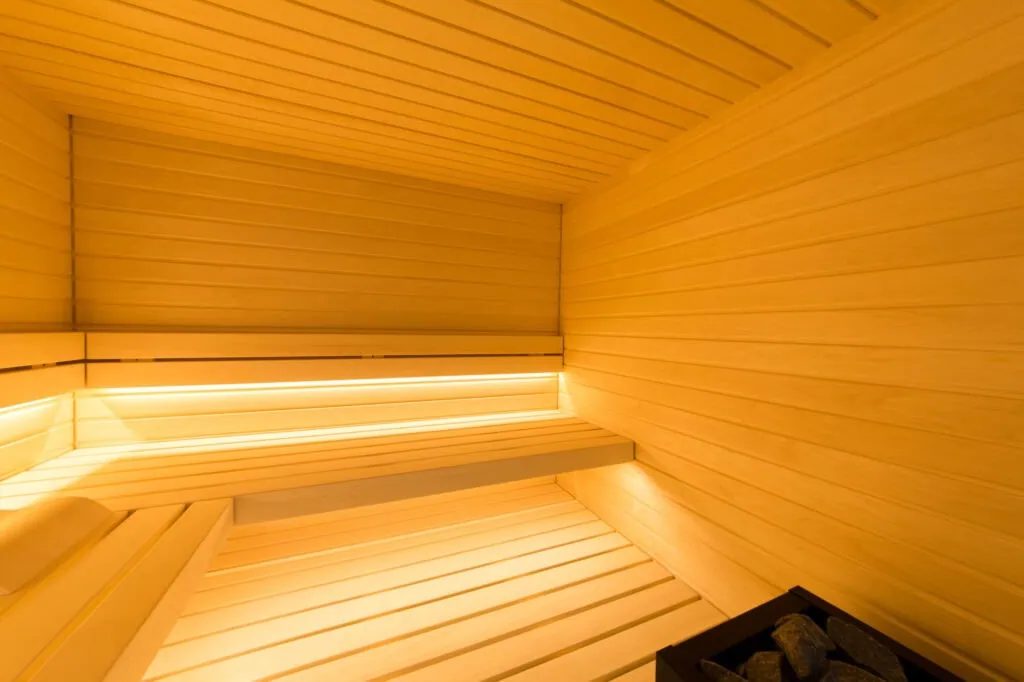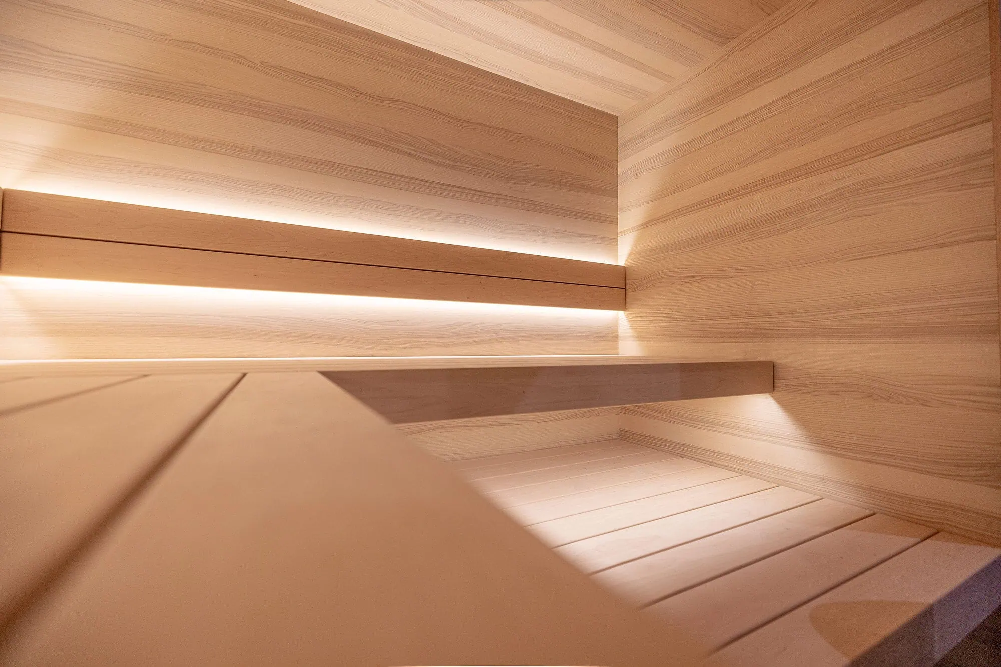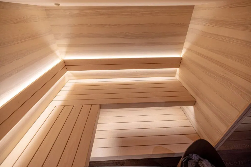 Sauna in hellem Espenholz mit waagerechter Verlegung. Die Saunabänke sind ebenfalls aus massivem Espenholz angefertigt.