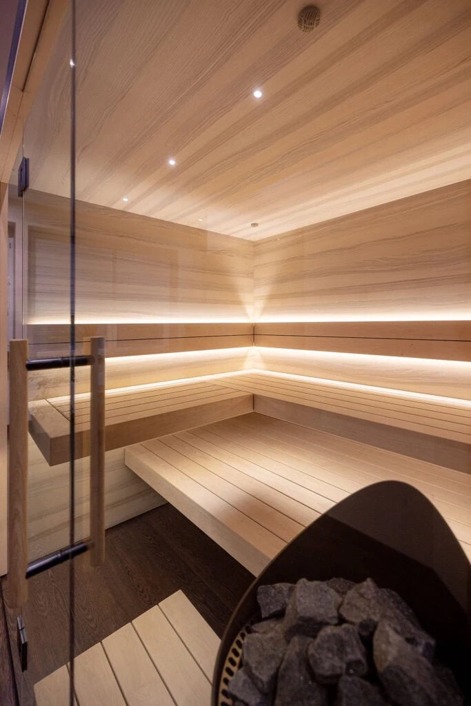 Sauna in Thermo-Eukalyptus Echtholzfurnier und großflächigem Naturstein mit waagerechter Verlegung. Die Saunabänke sind farblich abgestimmt aus massivem Thermo-Espenholz angefertigt. Ganzglasfront für eine transparente Optik. Saunabeleuchtung: indirekte LED-Beleuchtung als Effektbeleuchtung der hinteren Wand und in den Liegen.