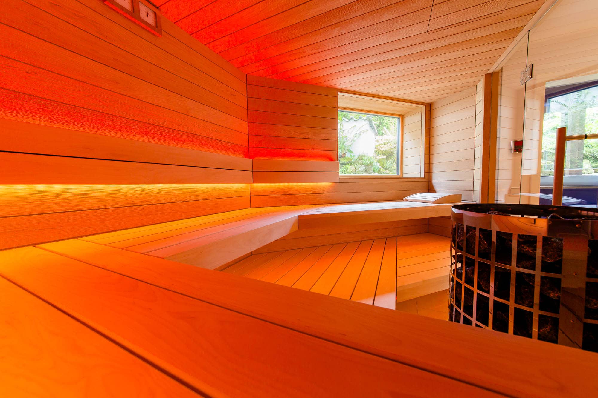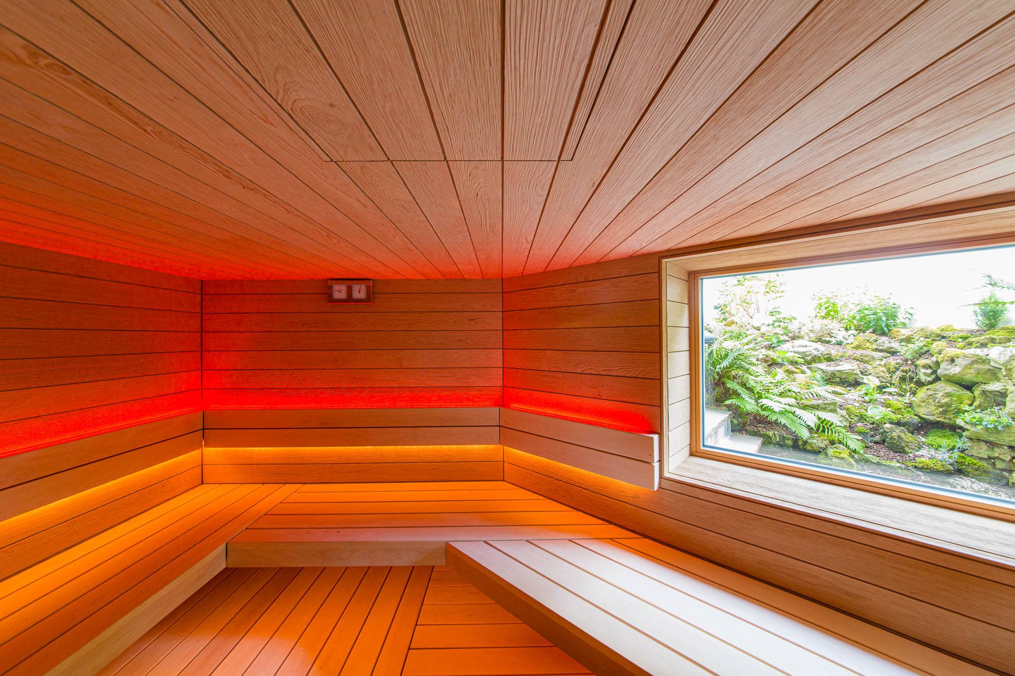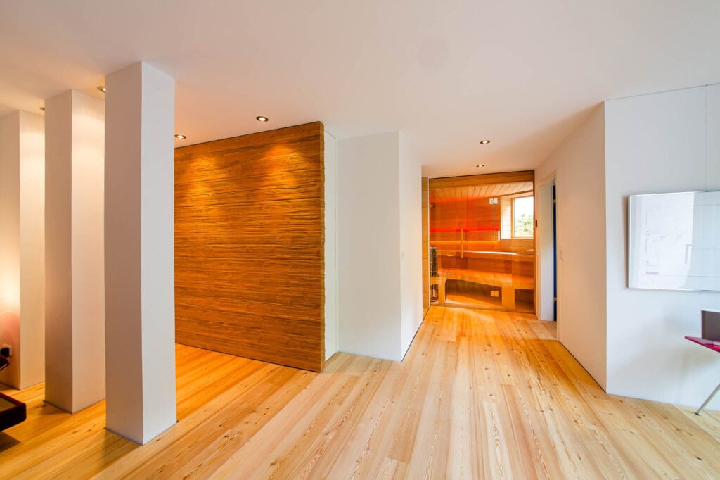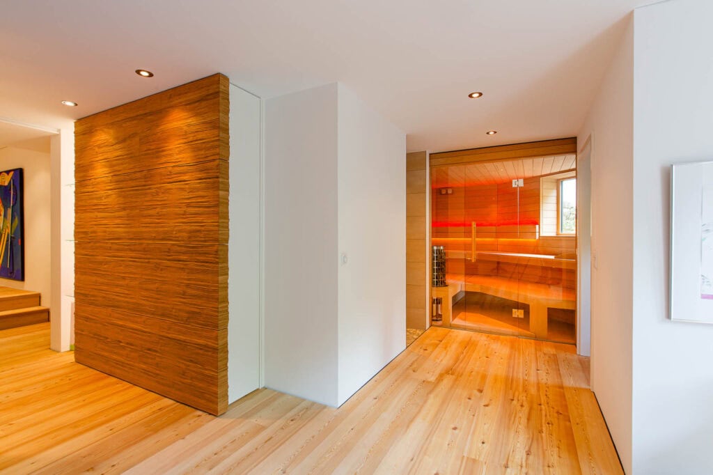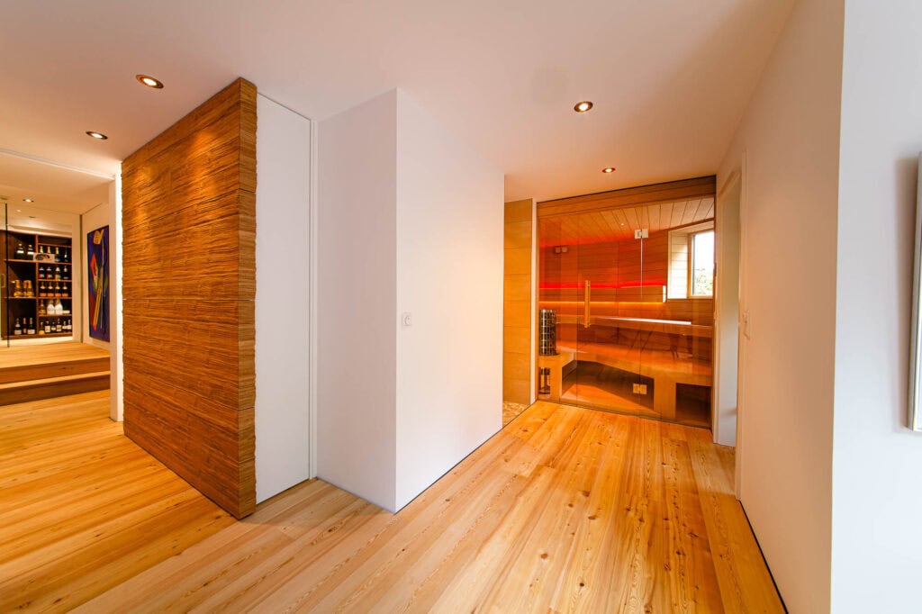 Eine maßgeschneiderte Wellnessoase im Untergeschoss, die trotz räumlicher Herausforderungen ein offenes und großzügiges Gefühl vermittelt. Die Sauna bietet ein intensives Saunaerlebnis mit Blick ins Grüne und ist perfekt auf die individuellen Bedürfnisse der Kunden abgestimmt.
