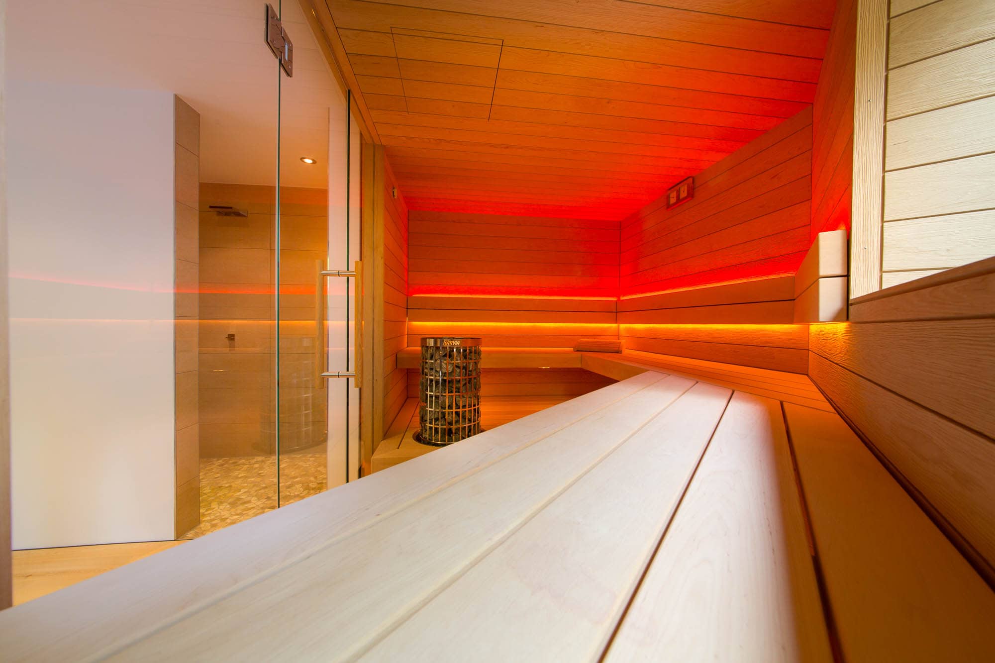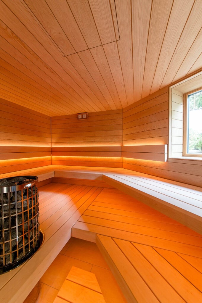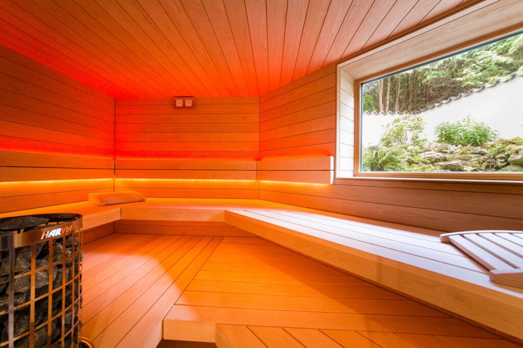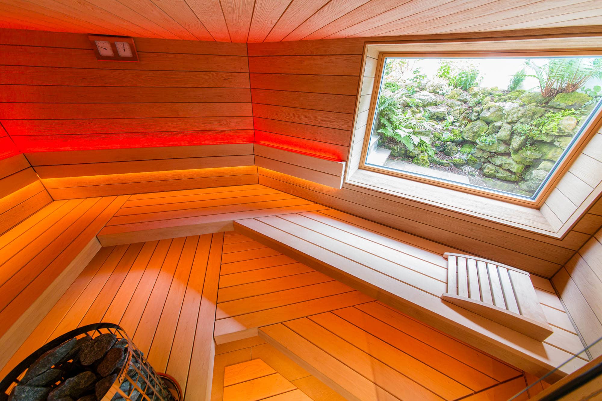 Eine maßgeschneiderte Wellnessoase im Untergeschoss, die trotz räumlicher Herausforderungen ein offenes und großzügiges Gefühl vermittelt. Die Sauna bietet ein intensives Saunaerlebnis mit Blick ins Grüne und ist perfekt auf die individuellen Bedürfnisse der Kunden abgestimmt.